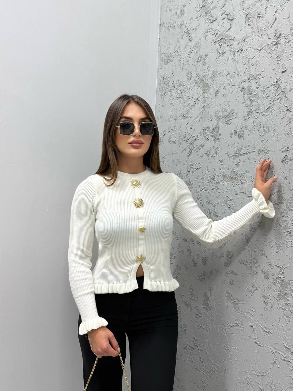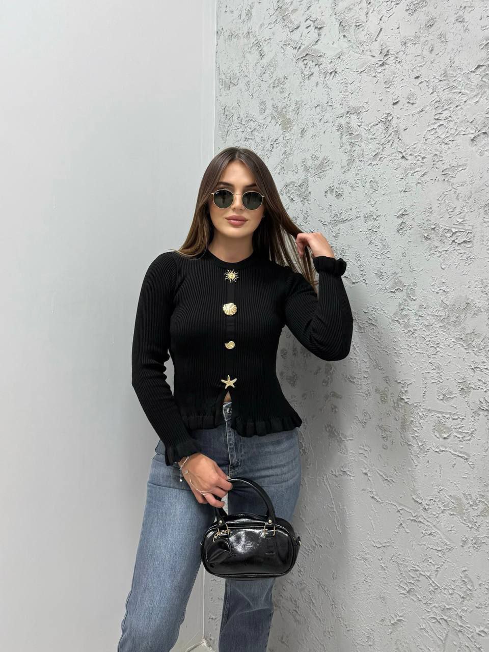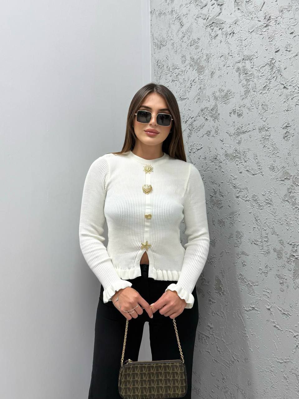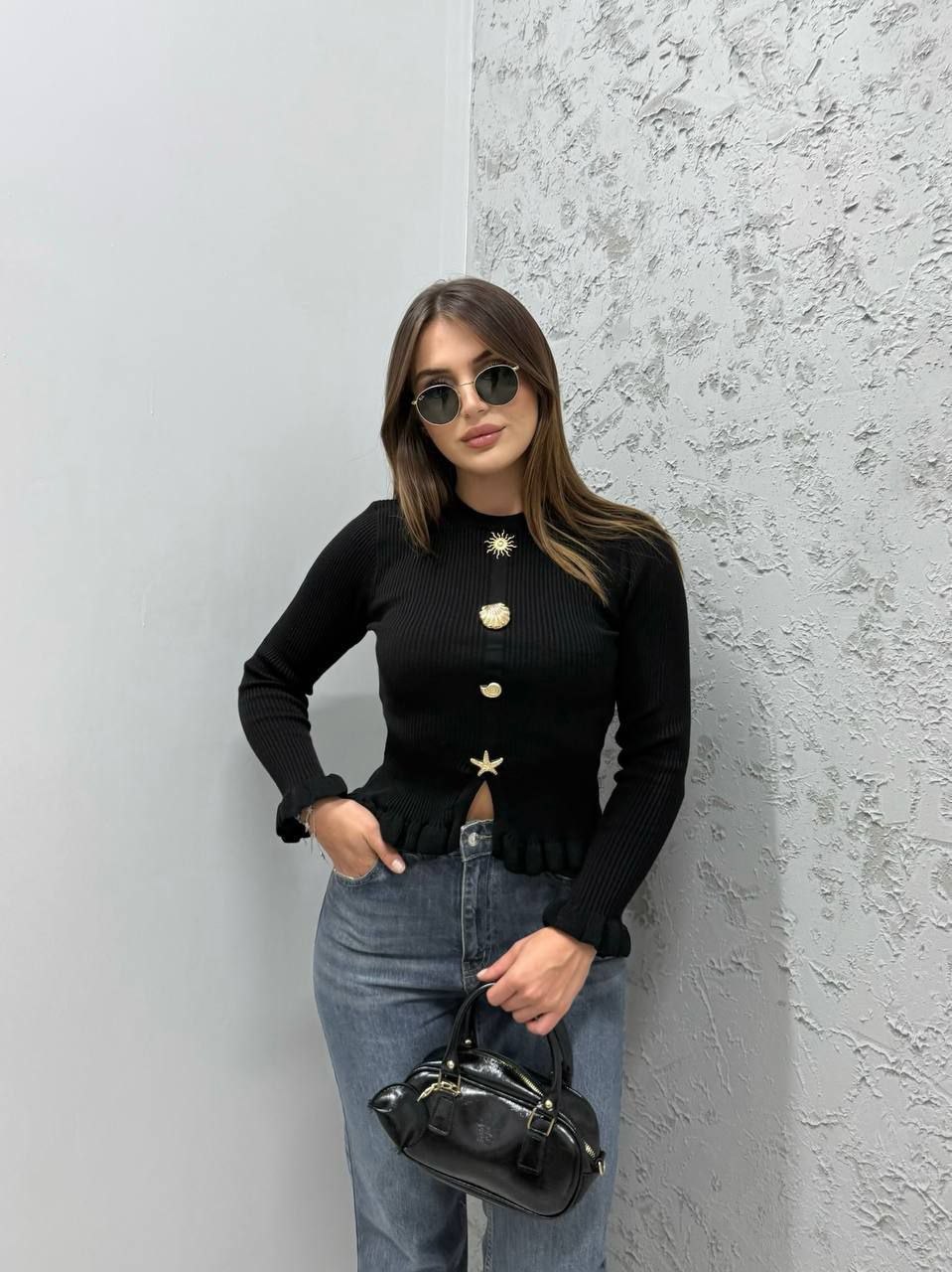 Altın düğme detayları ile zarafeti ve şıklığı bir arada sunar.